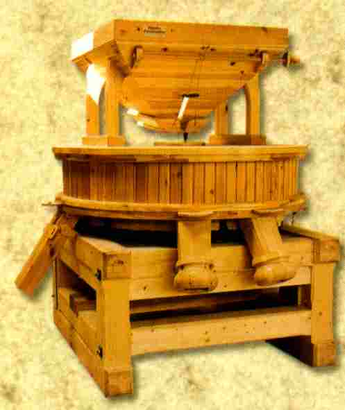 la mouture des céréales et des graines. Les meules sont en pierre et la structure est entièrement faite de bois, ce qui rend l'aspect
